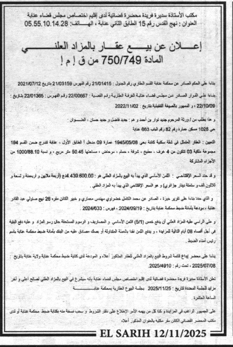 Il sera procédé à la vente au plus offrant et dernier enchérisseur le :