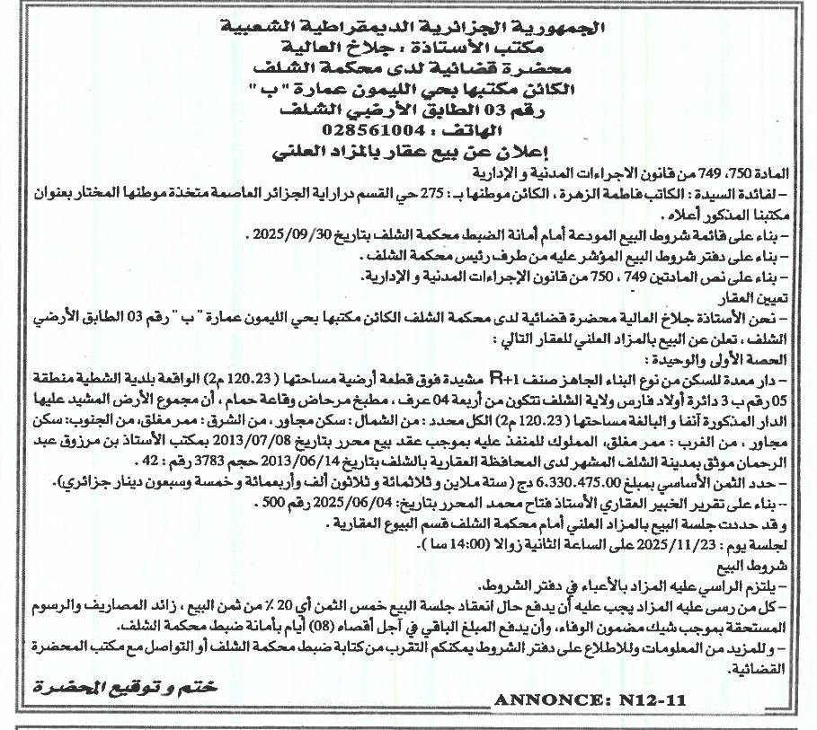 Il sera procédé à la vente au plus offrant et dernier enchérisseur le :