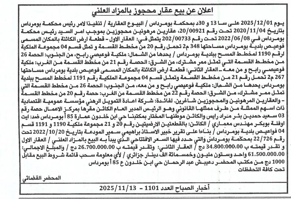 Il sera procédé à la vente au plus offrant et dernier enchérisseur le : 20/11/2025';