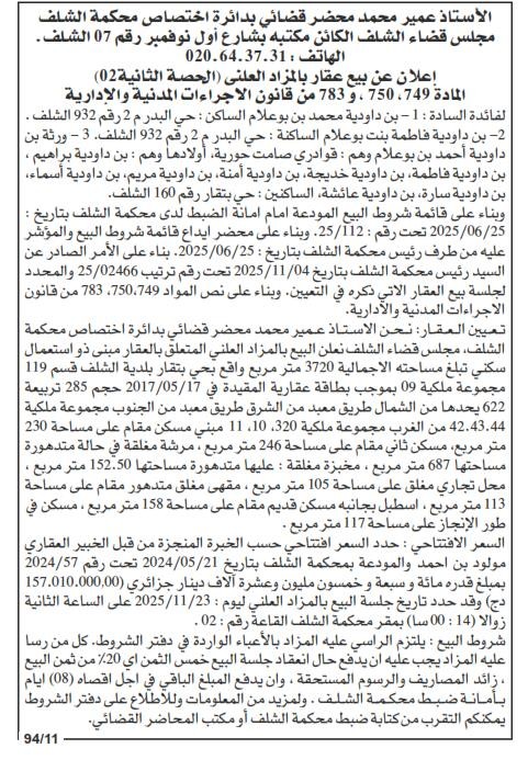 Il sera procédé à la vente au plus offrant et dernier enchérisseur le : 20/11/2025';
