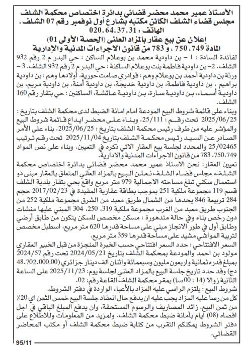Il sera procédé à la vente au plus offrant et dernier enchérisseur le :