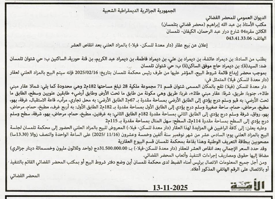 Il sera procédé à la vente au plus offrant et dernier enchérisseur le :