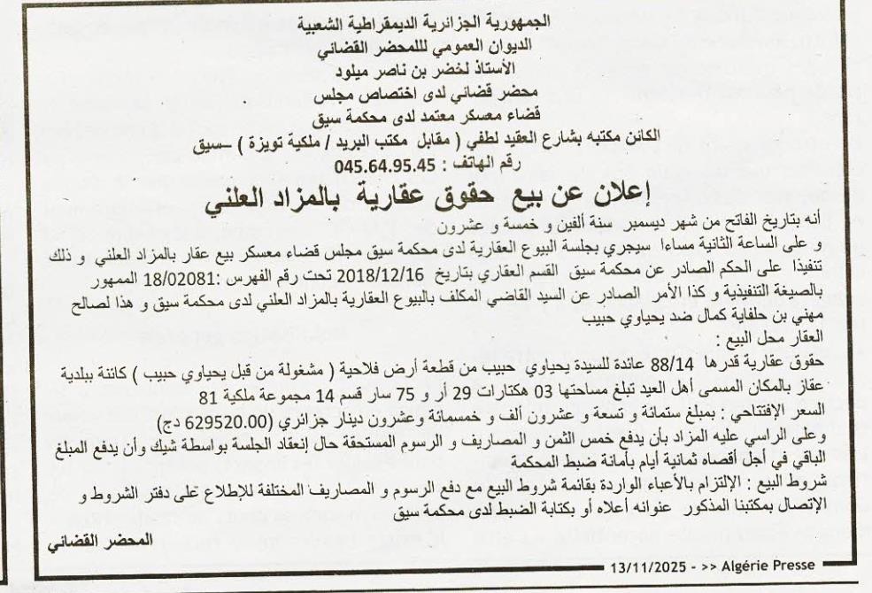 Il sera procédé à la vente au plus offrant et dernier enchérisseur le :