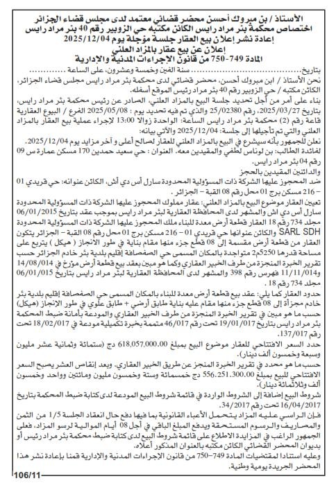 Il sera procédé à la vente au plus offrant et dernier enchérisseur le :
