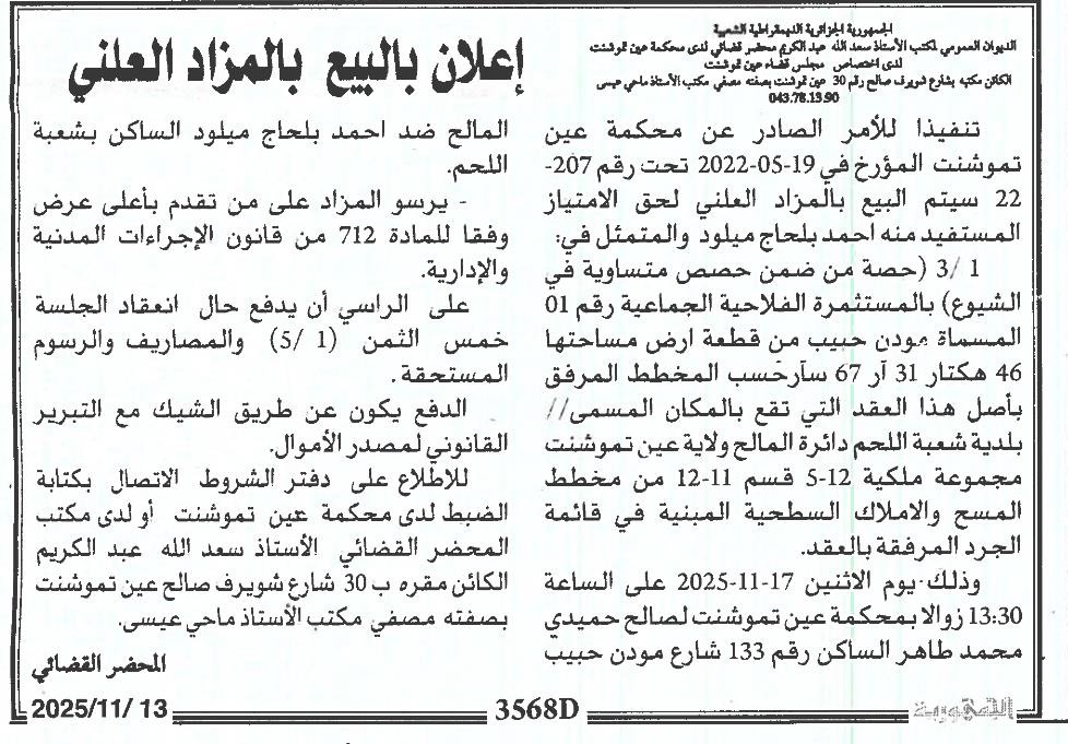Il sera procédé à la vente au plus offrant et dernier enchérisseur le : 17/11/2025';