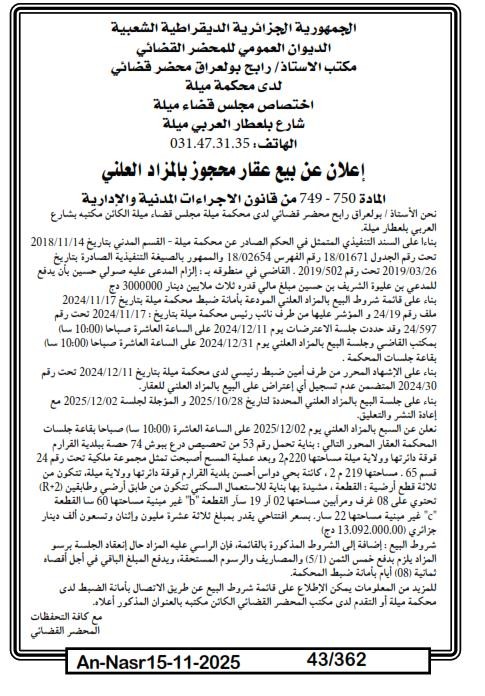 Il sera procédé à la vente au plus offrant et dernier enchérisseur le :