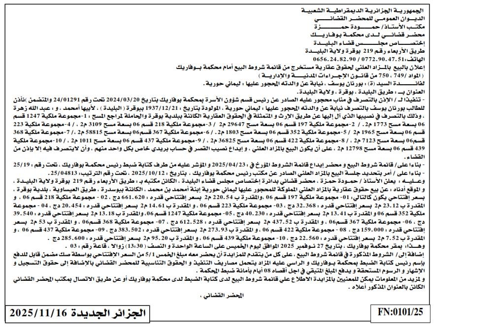 Il sera procédé à la vente au plus offrant et dernier enchérisseur le : 27/11/2025