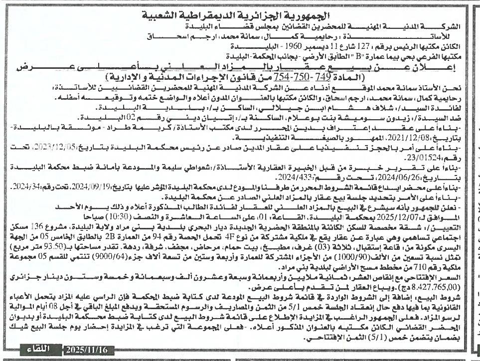 Il sera procédé à la vente au plus offrant et dernier enchérisseur le :
