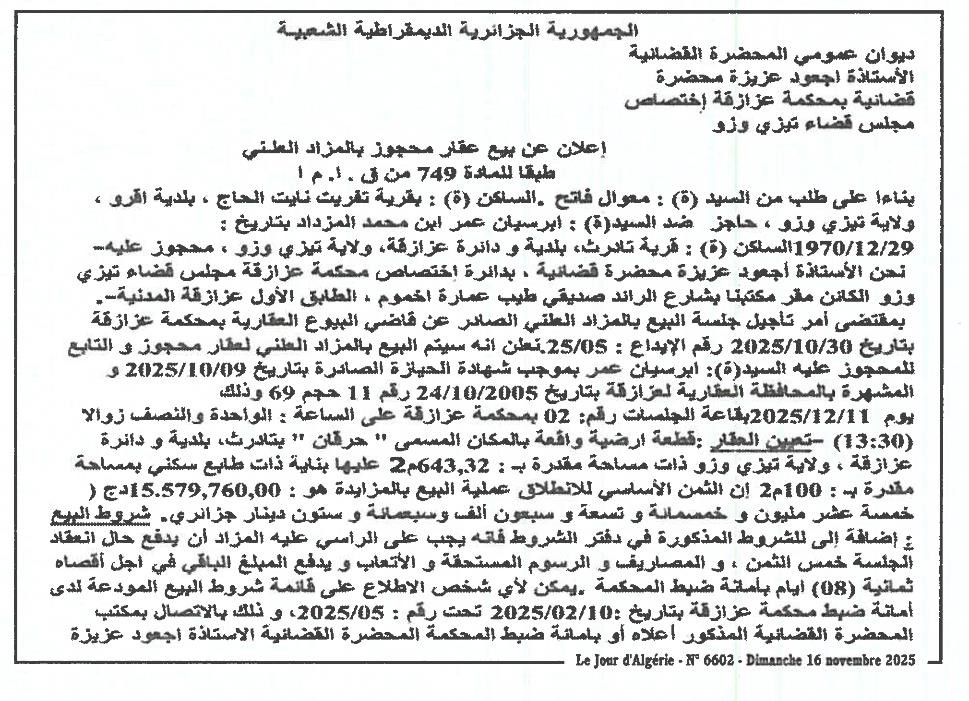 Il sera procédé à la vente au plus offrant et dernier enchérisseur le :