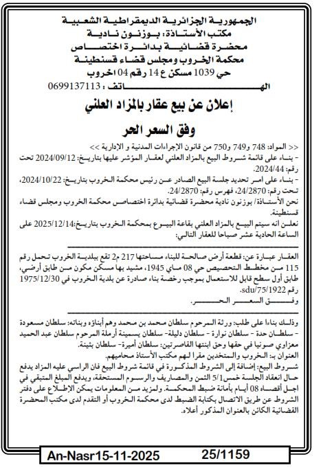 Il sera procédé à la vente au plus offrant et dernier enchérisseur le : 22/11/2025';