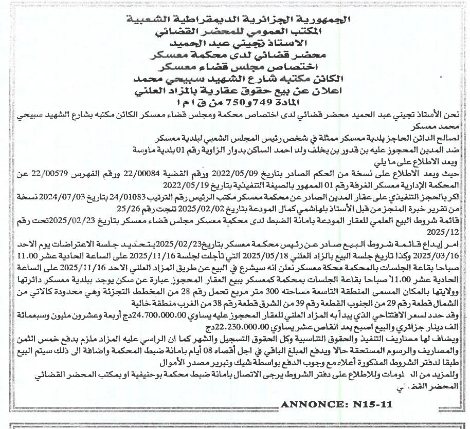 Il sera procédé à la vente au plus offrant et dernier enchérisseur le :