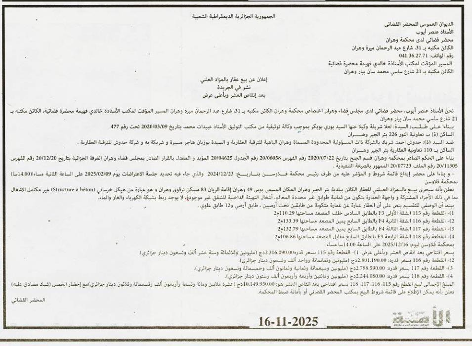 Il sera procédé à la vente au plus offrant et dernier enchérisseur le : 16/12/2025';
