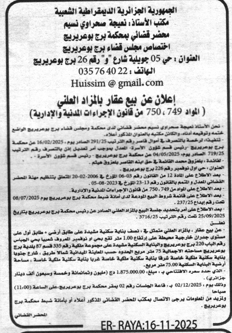 Il sera procédé à la vente au plus offrant et dernier enchérisseur le :