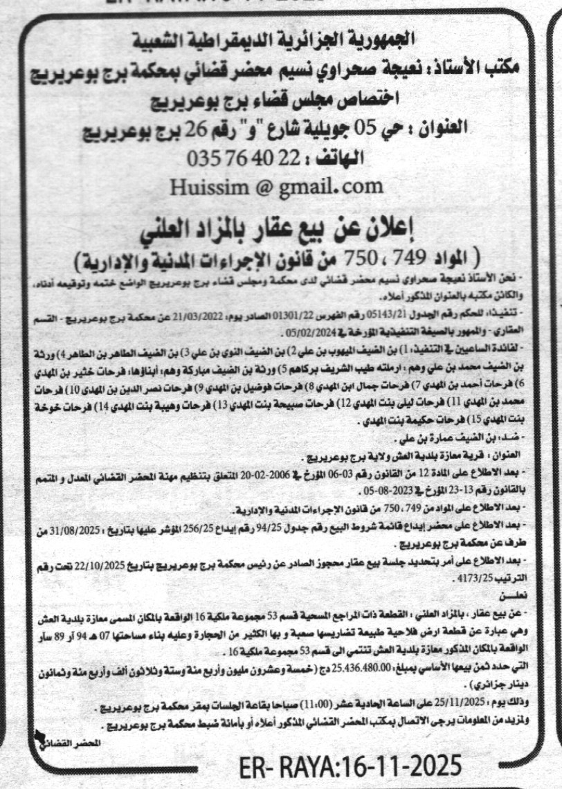 Il sera procédé à la vente au plus offrant et dernier enchérisseur le : 25/11/2025';