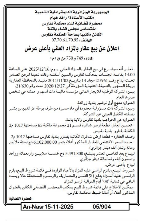 Il sera procédé à la vente au plus offrant et dernier enchérisseur le :