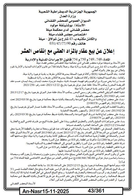 Il sera procédé à la vente au plus offrant et dernier enchérisseur le :