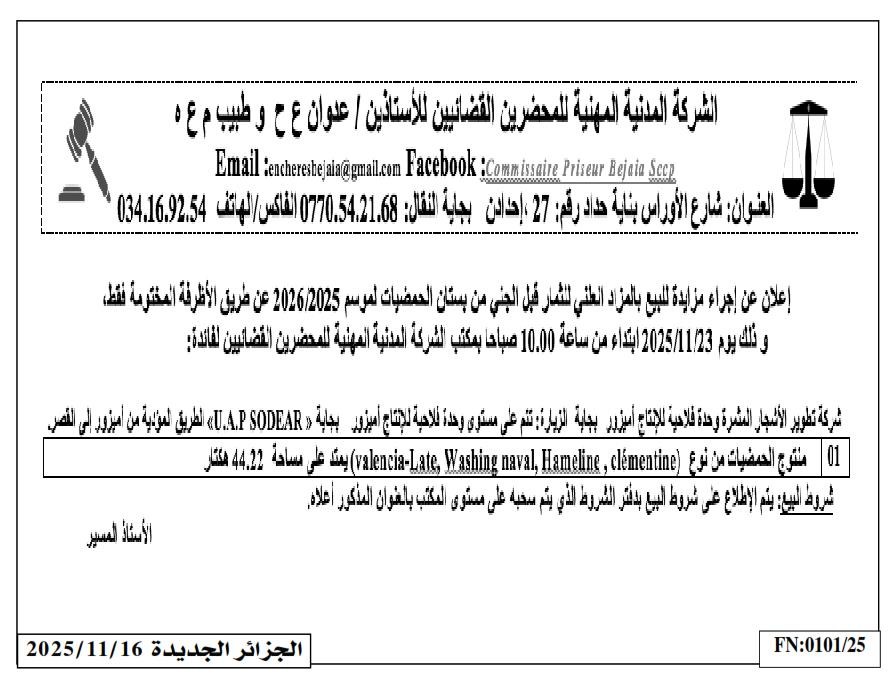 | Objet: Vente d'agrumes de type Valencia-Late, Washing Maval, Hameline, Clémentine s'étend sur une superficie de 44,22 hectares. | |