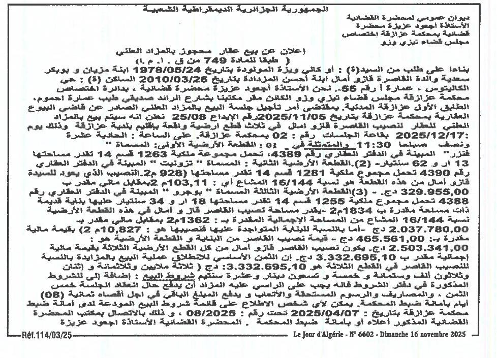 Il sera procédé à la vente au plus offrant et dernier enchérisseur le :
