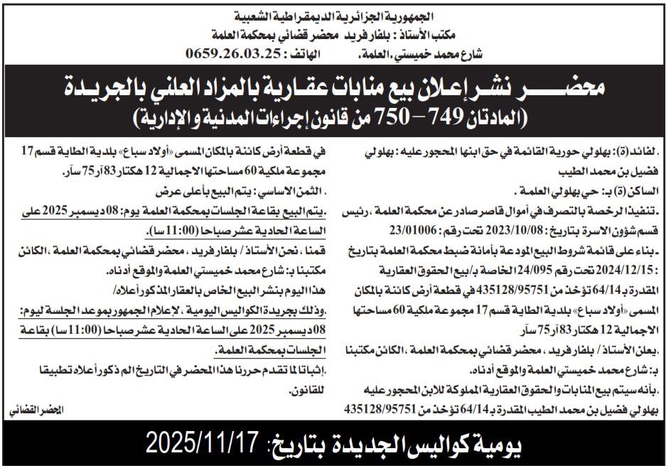 Il sera procédé à la vente au plus offrant et dernier enchérisseur le :