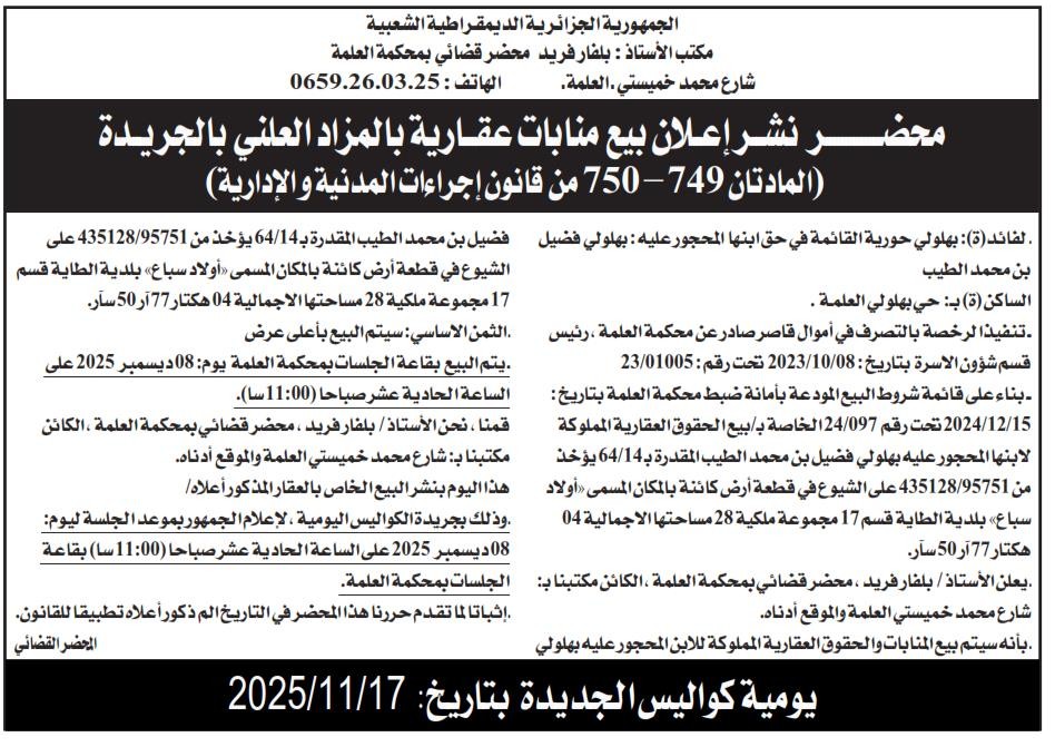 Il sera procédé à la vente au plus offrant et dernier enchérisseur le :