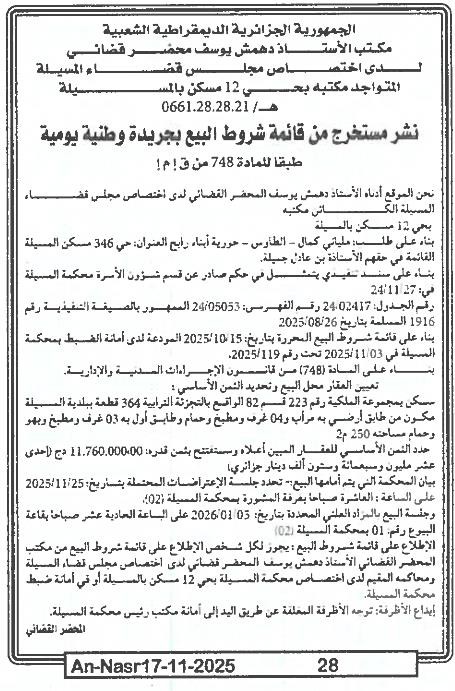 Il sera procédé à la vente au plus offrant et dernier enchérisseur le :