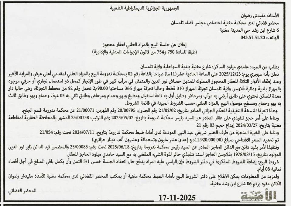 Il sera procédé à la vente au plus offrant et dernier enchérisseur le :
