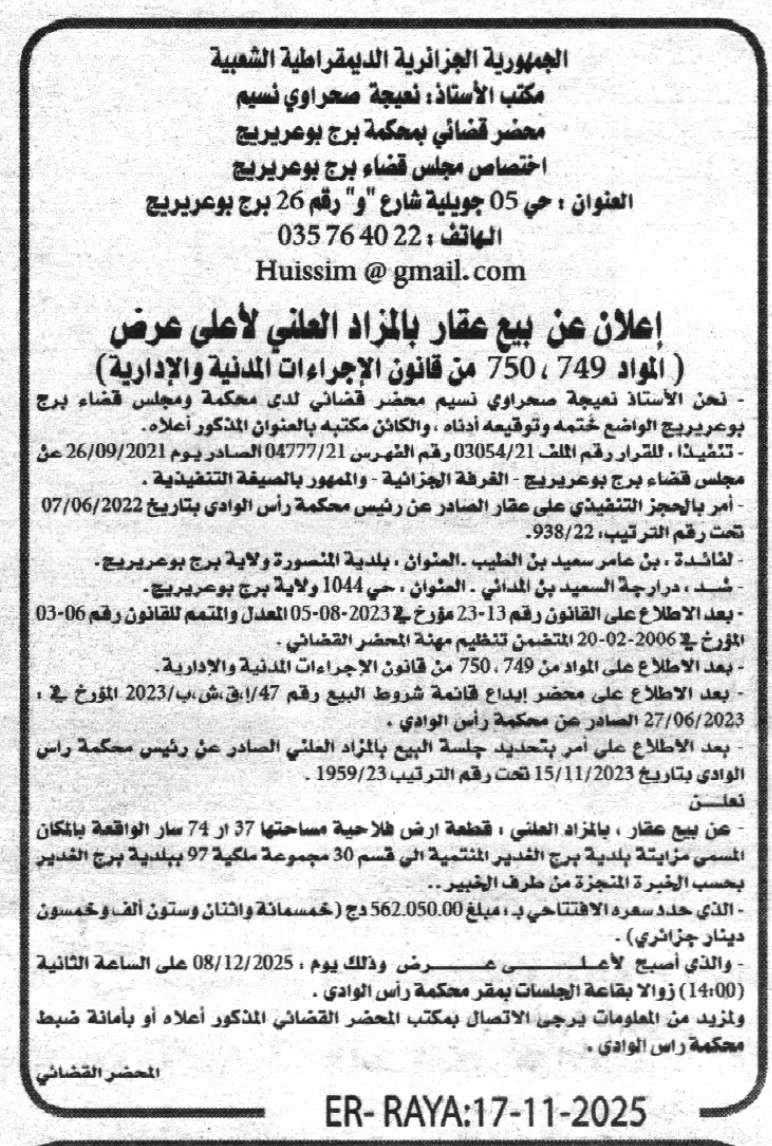 Il sera procédé à la vente au plus offrant et dernier enchérisseur le : 08/12/2025';