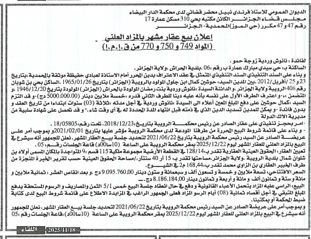 Il sera procédé à la vente au plus offrant et dernier enchérisseur le :