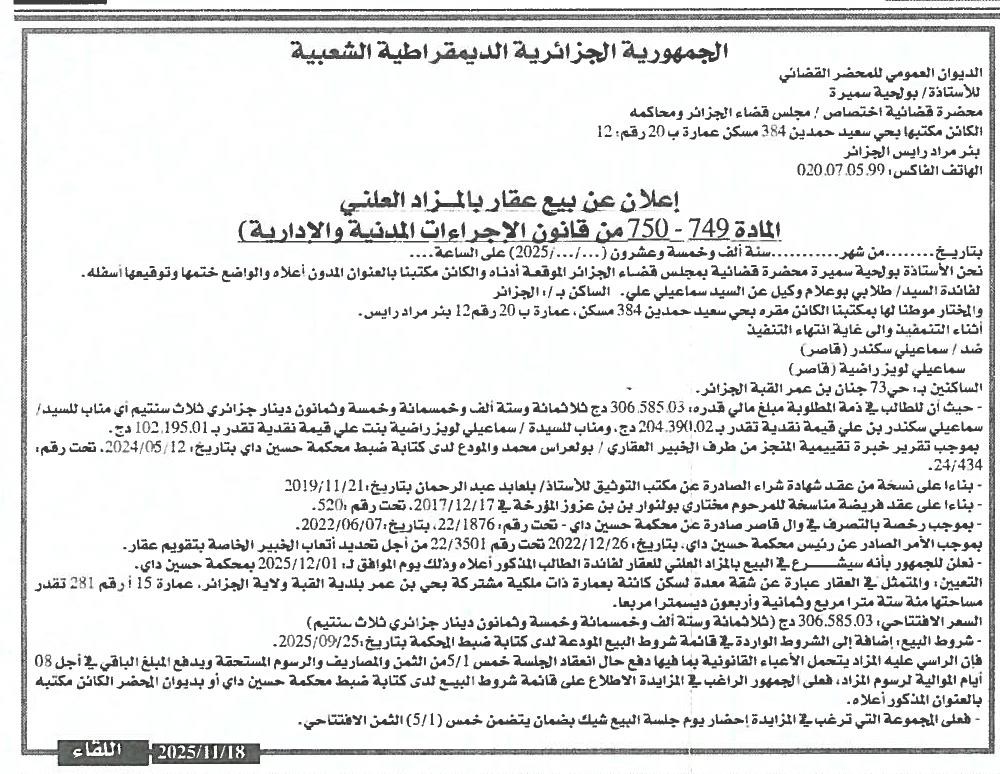 Il sera procédé à la vente au plus offrant et dernier enchérisseur le : 01/12/2025';