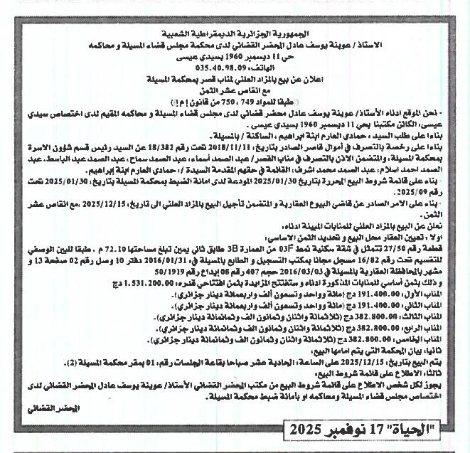 Il sera procédé à la vente au plus offrant et dernier enchérisseur le :