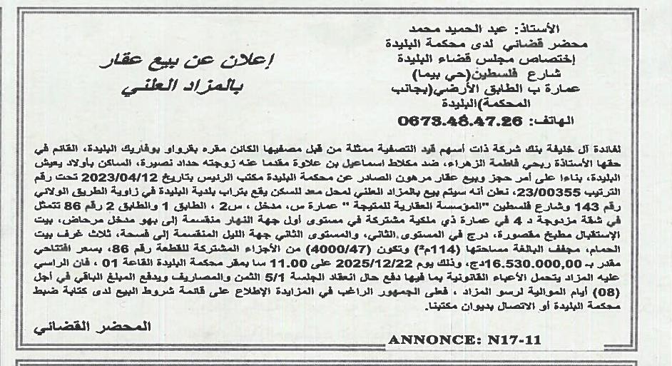 Il sera procédé à la vente au plus offrant et dernier enchérisseur le :