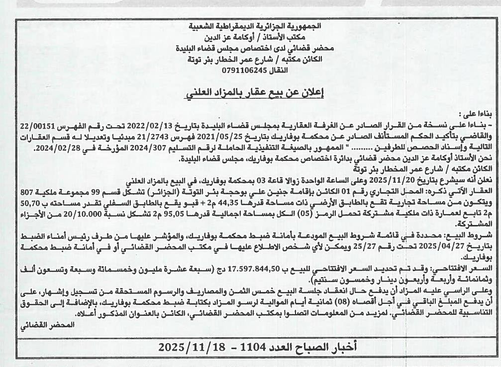 Il sera procédé à la vente au plus offrant et dernier enchérisseur le :