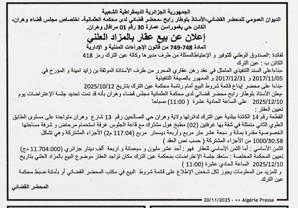 Il sera procédé à la vente au plus offrant et dernier enchérisseur le :