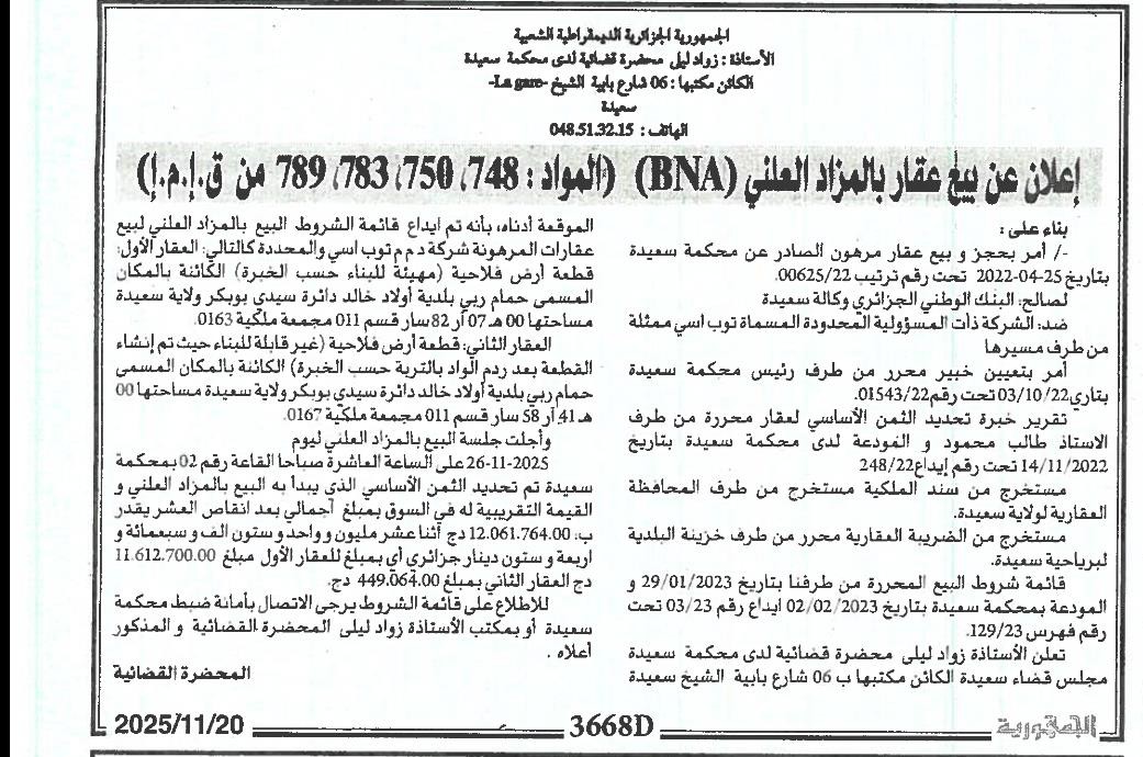 Il sera procédé à la vente au plus offrant et dernier enchérisseur le : 27/11/2025';
