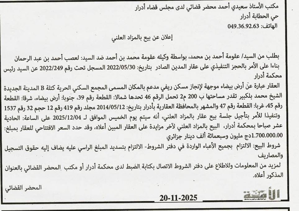 Il sera procédé à la vente au plus offrant et dernier enchérisseur le :