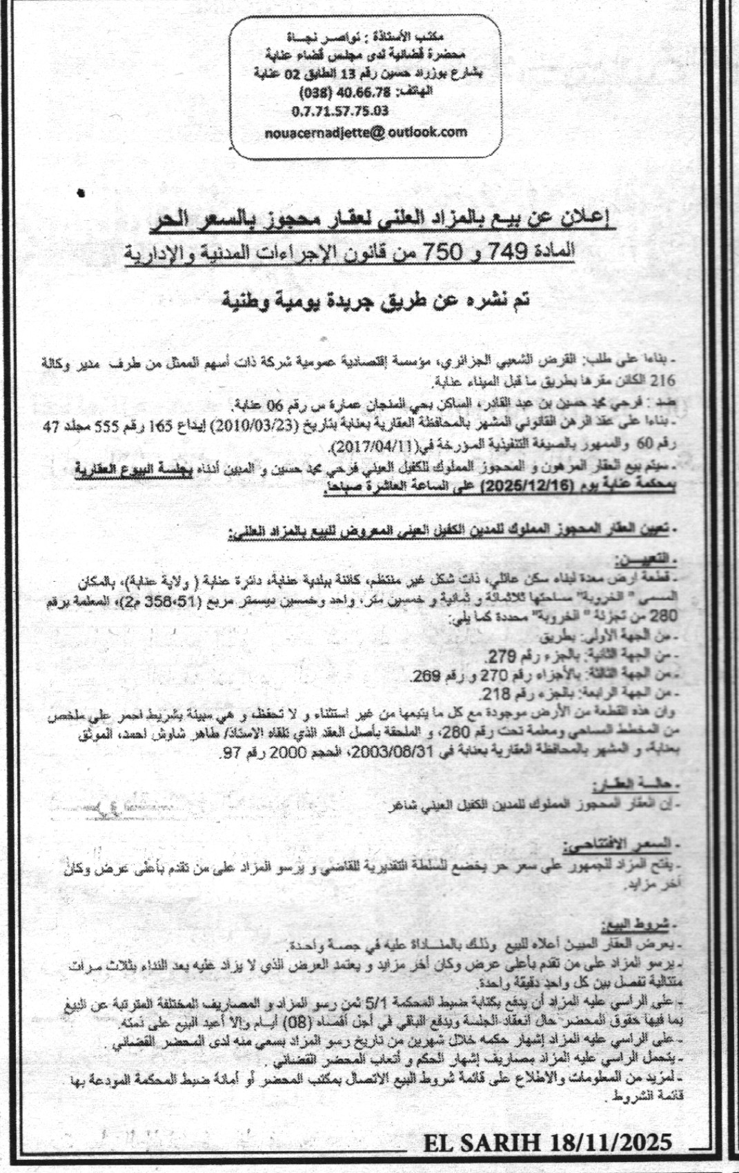Il sera procédé à la vente au plus offrant et dernier enchérisseur le :