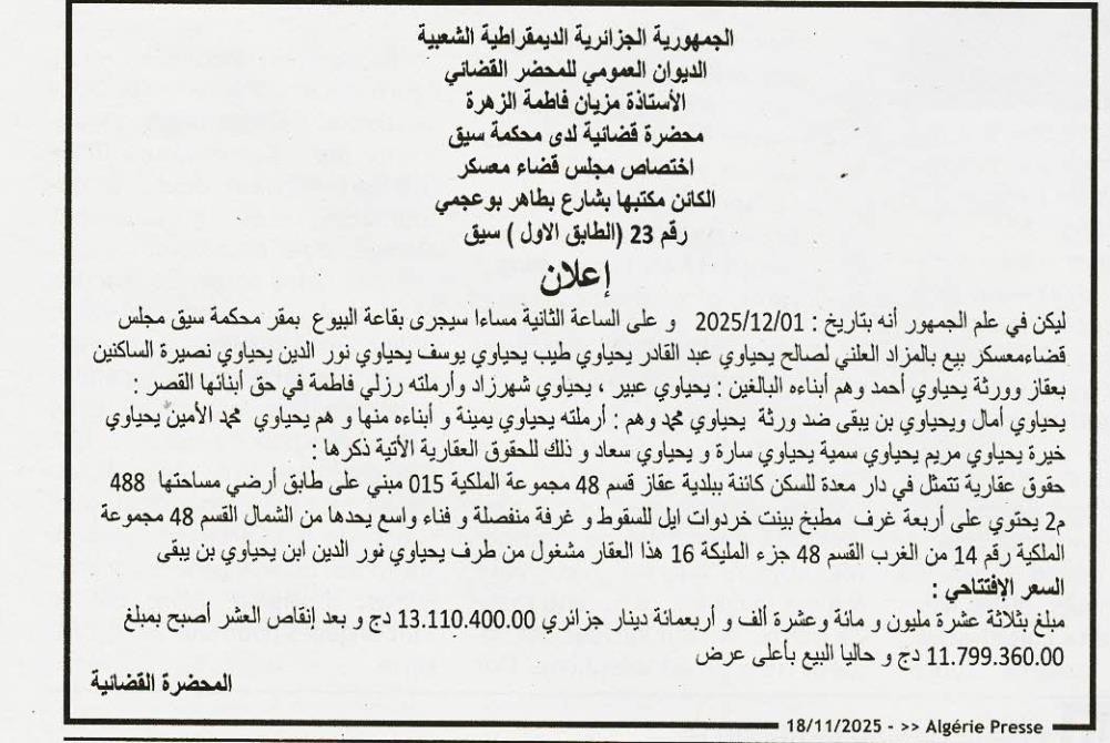 Il sera procédé à la vente au plus offrant et dernier enchérisseur le :