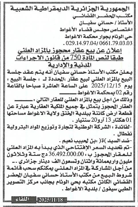 Il sera procédé à la vente au plus offrant et dernier enchérisseur le :