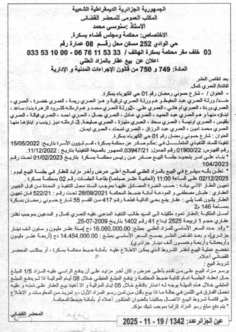 Il sera procédé à la vente au plus offrant et dernier enchérisseur le :