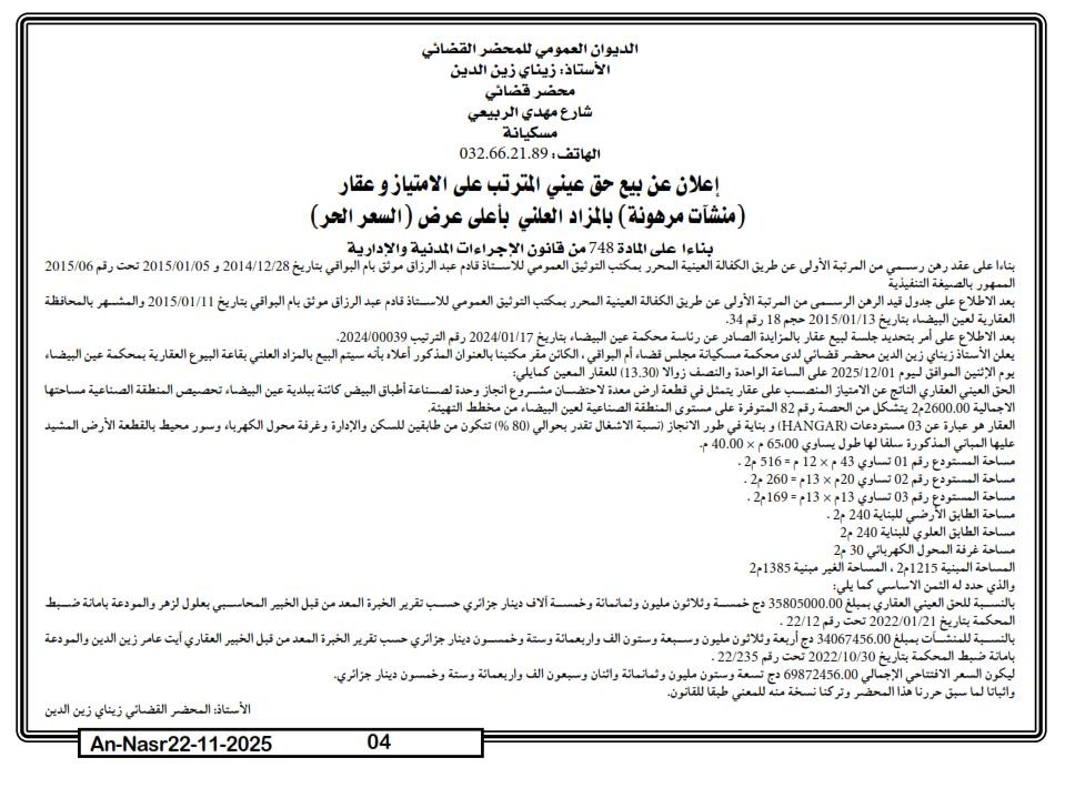 Il sera procédé à la vente au plus offrant et dernier enchérisseur le :