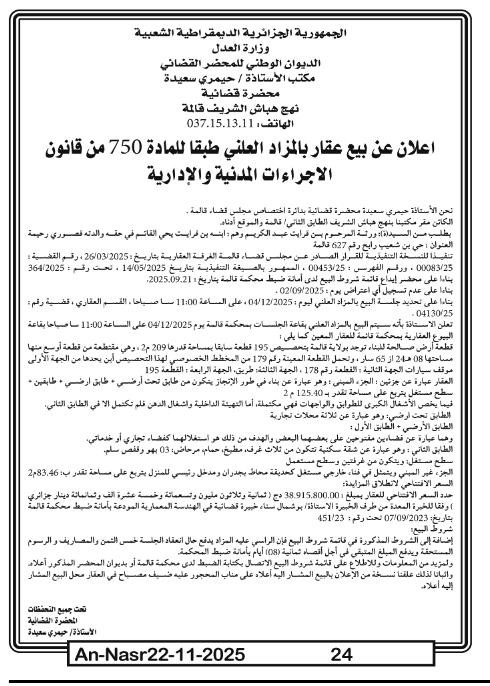 Il sera procédé à la vente au plus offrant et dernier enchérisseur le :