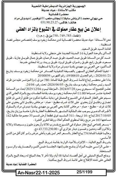 Il sera procédé à la vente au plus offrant et dernier enchérisseur le : 29/11/2025';