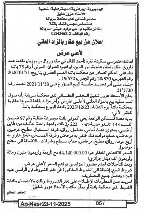 Il sera procédé à la vente au plus offrant et dernier enchérisseur le :