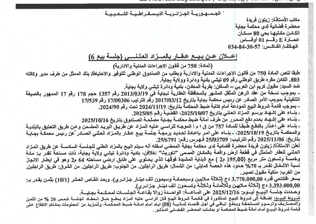 Il sera procédé à la vente au plus offrant et dernier enchérisseur le :