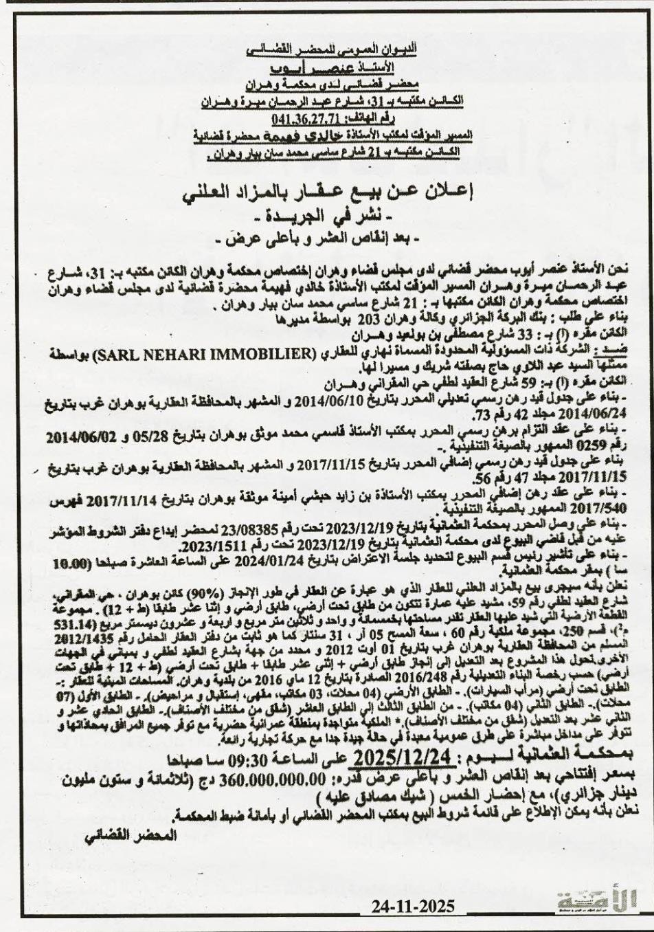 Il sera procédé à la vente au plus offrant et dernier enchérisseur le :