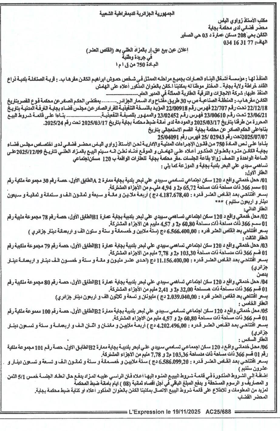 Il sera procédé à la vente au plus offrant et dernier enchérisseur le :