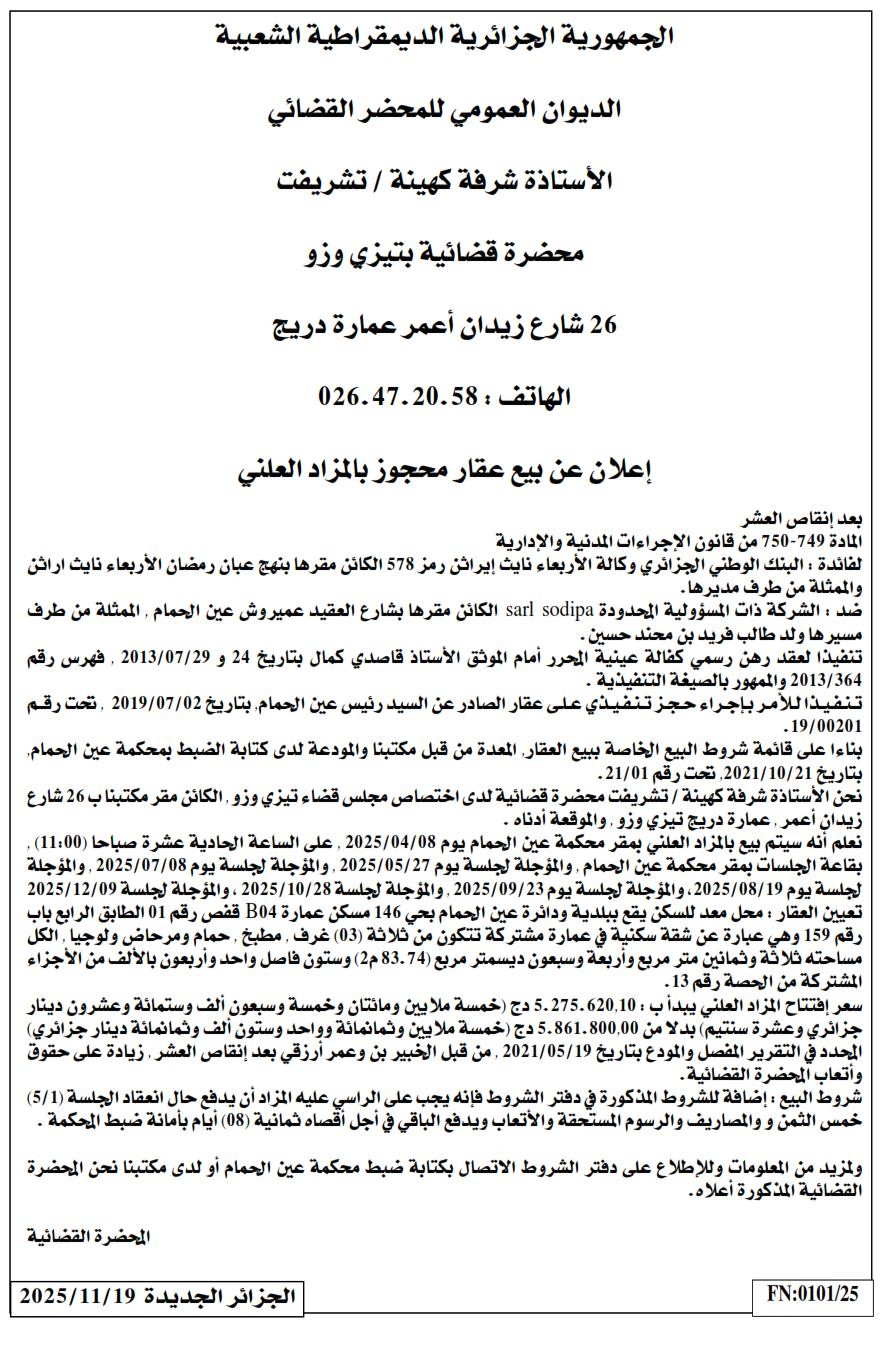 Il sera procédé à la vente au plus offrant et dernier enchérisseur le :