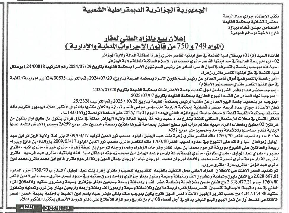 Il sera procédé à la vente au plus offrant et dernier enchérisseur le :