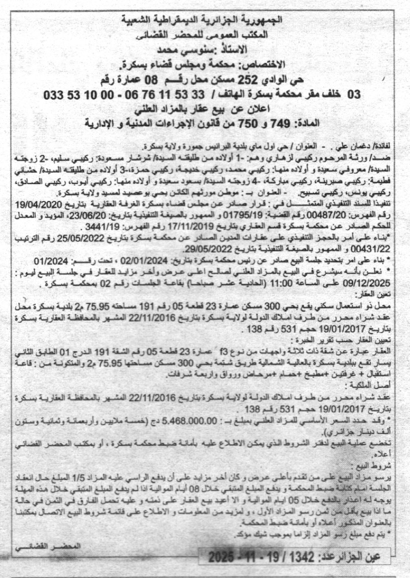 Il sera procédé à la vente au plus offrant et dernier enchérisseur le :