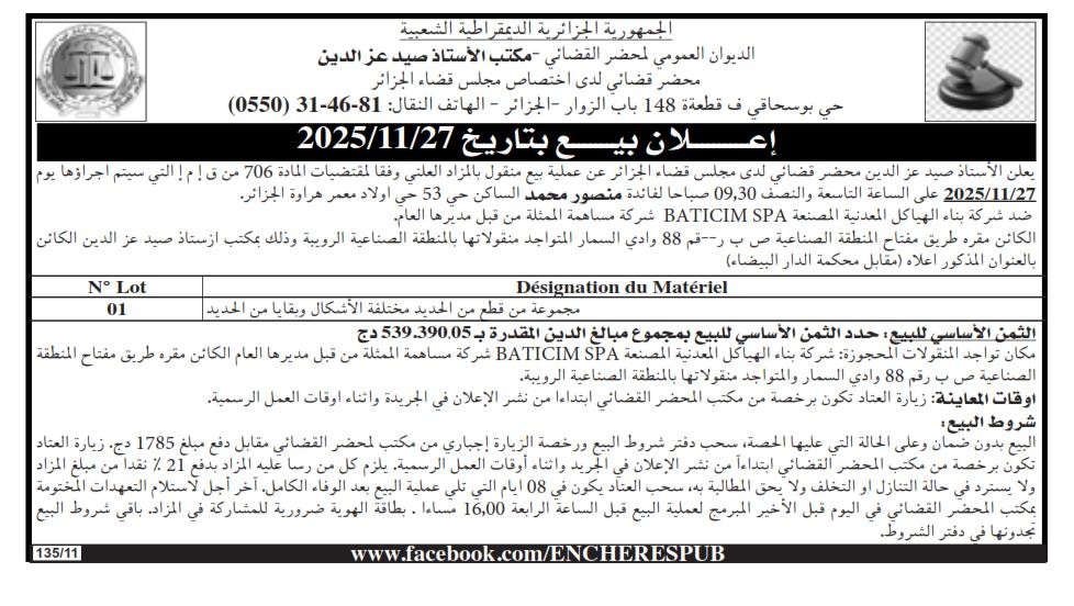 | Objet: Vente d'un ensemble de pièces de fer de différentes formes et des restes de fer. | |
